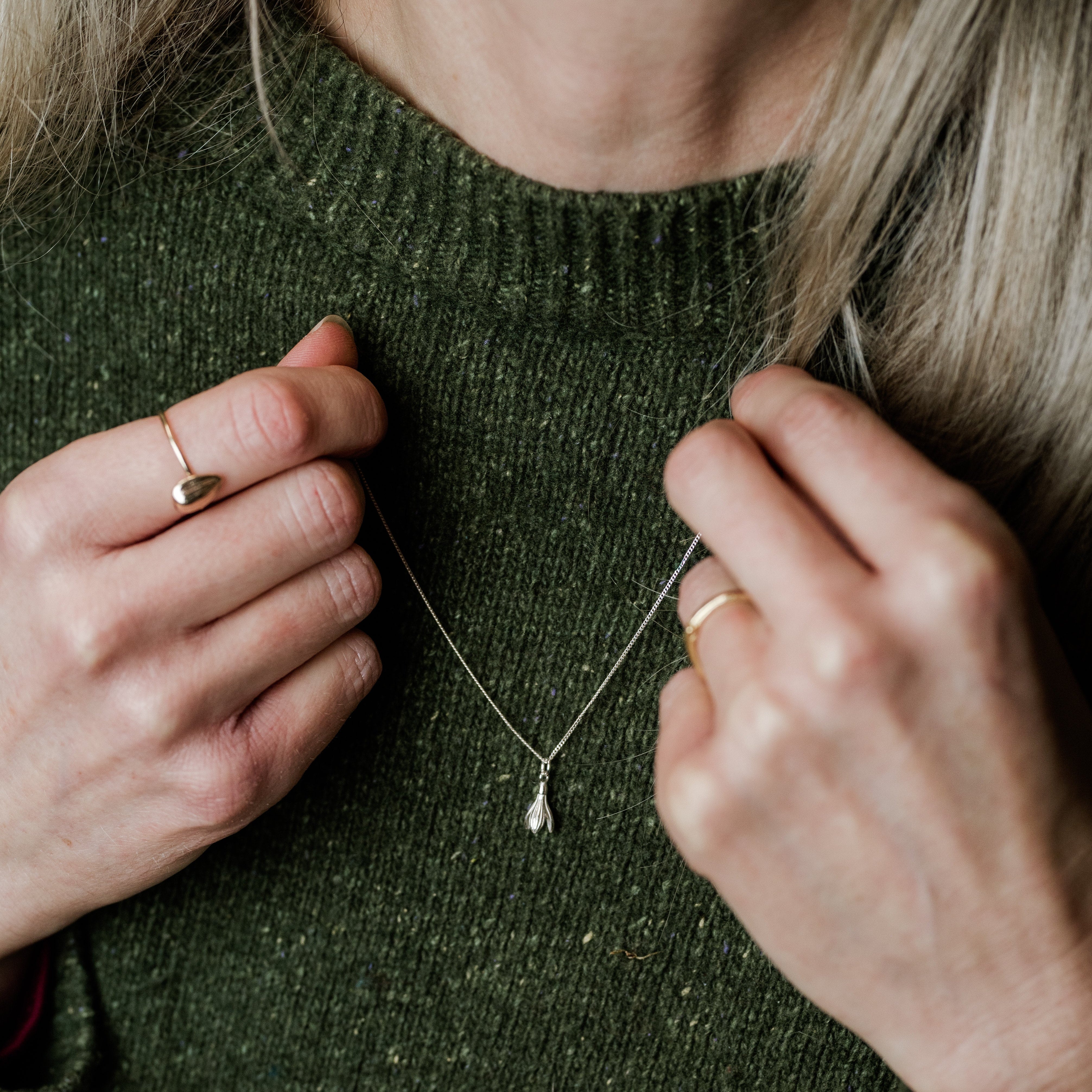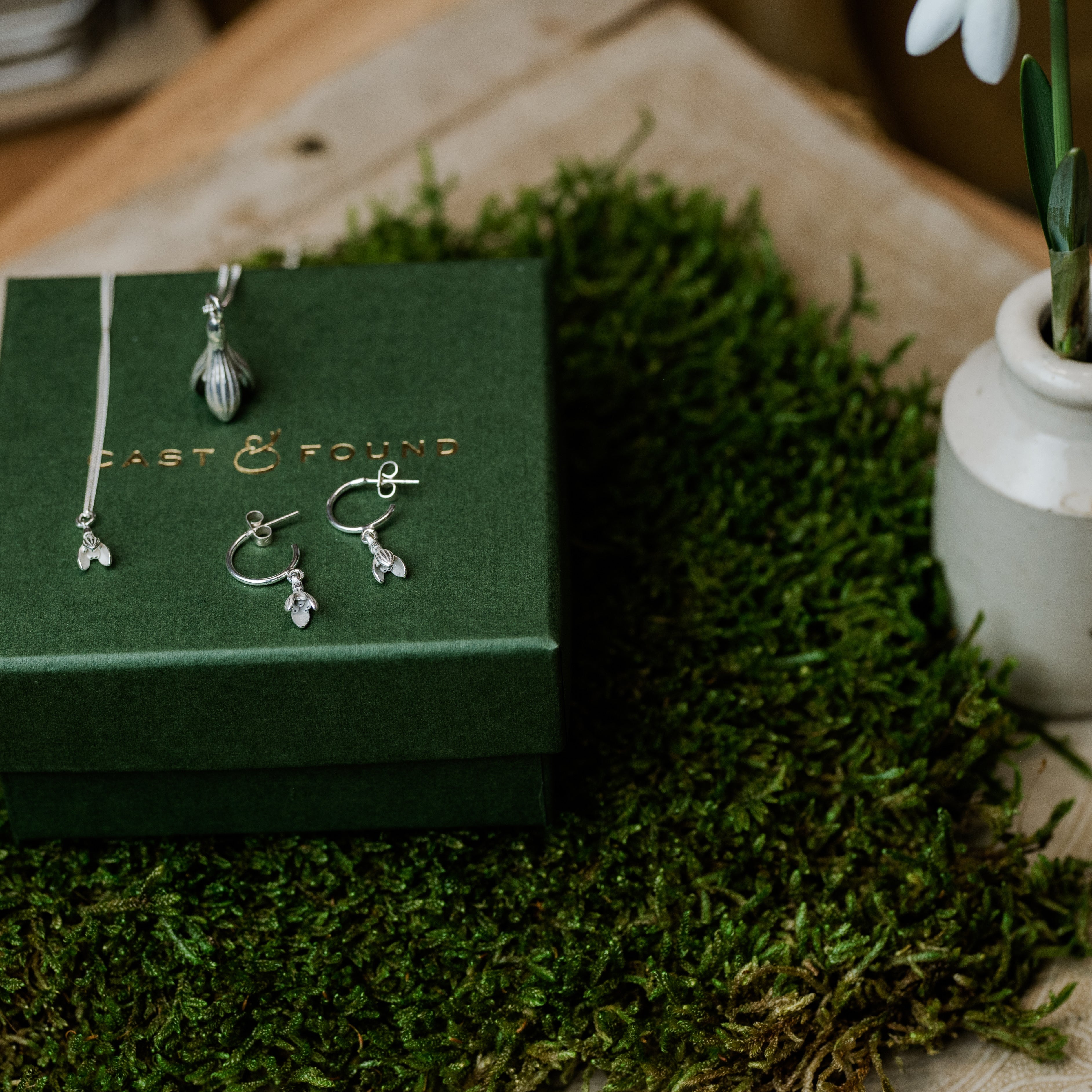 This new, beautiful, solid 925 pendant and earring set is inspired by the magical snowdrop and is a smaller version of our bestselling Snowdrop Necklace (shown in the first image for scale). As the first flower of winter, this delicate flower is said to symbolise hope, rebirth and comfort. A meaningful and very pretty design, perfect for gifting all year round.